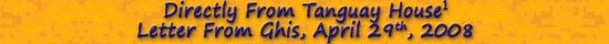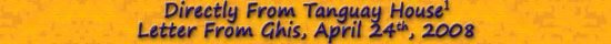 Document in French 1. Tanguay House is Montreal’s Prison for Women Original Document in French English Translation Tanguay House , April 15th 2008. Bonjour! First of all, let me thank you from the bottom of my ? for you constant and unfailing support. I am very touched by it. I am living my present prison experience with serenity and peace, in harmony with my surrounding environment. My ego cries and my soul rejoices. This is a perfect and ideal occasion to live a great internal adventure, the only one truly worthy of any interest. Those of you who are concerned about my present and future state have nothing to worry about. Humanity is in the midst of an evolutive crisis, and I am simply one of its instruments. As a matter of fact, so are you! Let us participate in this, instead of resisting it. Until we meet again, I leave you all my affection, Ghis |