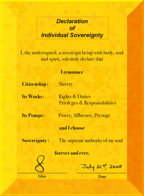 REAL SOVEREIGNTY IS INDIVIDUAL AND INTERNAL Only an individual of the human species, a person, can be sovereign. This eliminates all the false sovereignties of gods and goddesses, Allah, Yahweh, God, kings and queens, popes, dalai-lamas and other spiritual leaders, the United Nations, continents, nations, countries, homelands, the Constitution, the Bible, the Koran, the Gospels, all laws, etc. All these so-claimed sovereigns preside over hierarchies that operate through the separation between Authority and Obedience. Consequently, these sovereignties are illusory and deceitful, and inevitably bring on disorder and death. True sovereignty is internal. It is found in the soul, the individualisation of the One Being that is the creative force of the whole universe. The soul is the supreme authority whose law is recognized and obeyed by the sovereign person. The soul never makes mistakes. She represents truth and guarantees justness, order and peace. She is the true internal sovereign. Thus, we can affirm that: REAL SOVEREIGNTY IS UNLIMITED, IMMORTAL, IMMUABLE The sovereign person remembers who she really is, both the creatrix(2) and the creature, both Authority and Obedience. Her soul commands and her body obeys. She is under the full governance of her soul. She bathes in peace and vibrates with joy. The war for power is over. The soul governs and the person acts as her conscience dictates, for the love of her true self. The ego disappears a little more, each time a fear is healed. The person’s behaviour becomes that of a creative being, omnipotent and responsible, the guarantor of all that happens in her life. The sovereign person is conscious of her true identity – the creative spirit inherent to all created matter – and she behaves as such. She abandons her old ways of living. She stops seeing herself as a poor creature, the daughter of an external creator, the god of death. She ceases her submission to external laws, the laws of death. She no longer gives her power away to external authorities, the servants of death. She lets go of all the teachings found in sacred books – Bible, Koran, Vedas, Torah – that perpetuate death. She no longer belongs to a family, a homeland, a country, a religion, a race, a tradition, a culture or a planet, since they all represent the limits of death. She refuses to venerate a science that teaches the lies of death. Today, the sovereign person celebrates a life-without-death. She celebrates herself! I REMEMBER WHO I AM Ghis